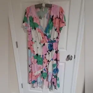 Chic dress with pastel abstract design. Features soft shades of pink, green, and blue. Ideal for a stylish statement. This dress is very comfortable, perfect for hot weather, cotton 100%, fits size 20, I wore it once and now drycleaned. It has a belt of the same fabric.