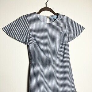 Chic blue and white striped dress. Features ruffled hem with red accents. Perfect for casual outings.