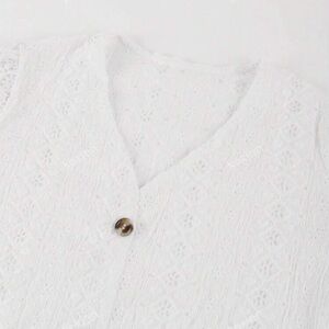 This elegant white lace top is perfect for any occasion. Featuring intricate lace detailing and stylish buttons, it adds a touch of sophistication to your wardrobe.