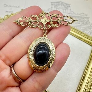 Vintage Gold Bar Pin Brooch Locket Pin Black Cabochon Dangling Locket Jewelry