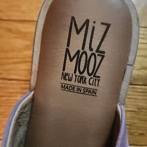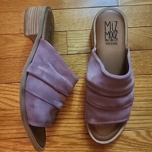 Eur 40 US Sz 10 Miz Mooz Mali Lavender Purple Leather Slip-On 1.5in Block Heel Slip-On Open-Toe Slide Sandals in excellent condition, no flaws to mention