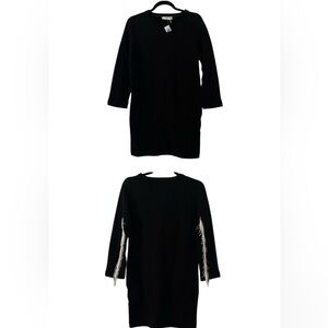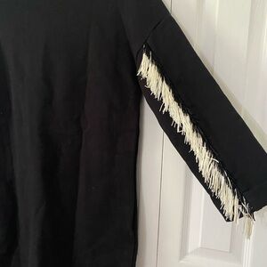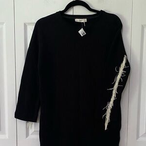 Elegant black sweater dress with a simple design. Perfect for any occasion. Fringe detailing on sleeves.