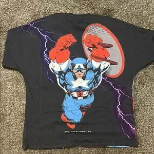 Embrace your superhero spirit with this Marvel short sleeve tee, featuring dynamic Captain America graphics. The bold prints stand out against a black and blue backdrop, offering a striking look for any fan. Bootleg tee done by Thr1ftL1f3. AOP of captain America and Spiderman. Size XXL men’s. Lightly used.