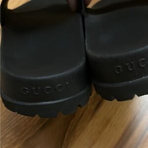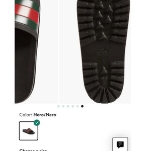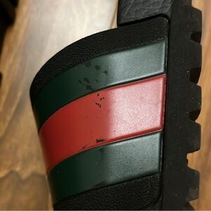 Step into elegance with Gucci's black and red loafers, showcasing a striking slip-on design adorned with bold stripes. These loafers combine style and comfort, making them an ideal choice for both casual outings and refined gatherings. The smooth finish adds a touch of sophistication to any ensemble. The shoes do have visible scratches.