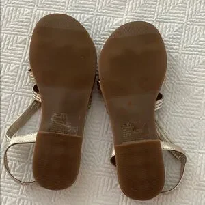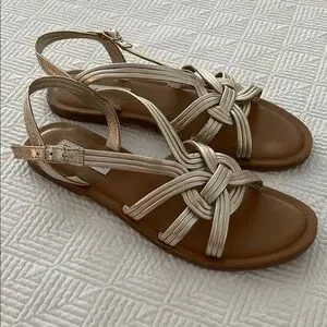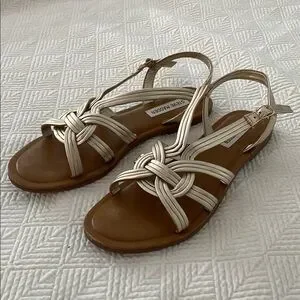 These Steve Madden sandals boast a sophisticated strappy design in light gold, perfect for warm weather. The elegant lattice-like pattern and adjustable slingback strap offer both style and comfort. With a flat sole and a warm brown footbed, they are ideal for casual outings. Worn twice. Good condition with very minor scuffing on the footbed.