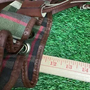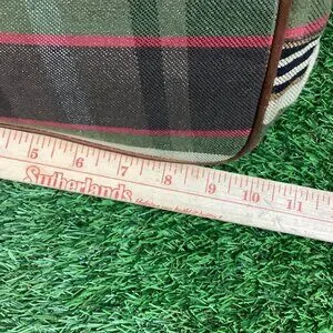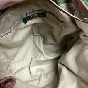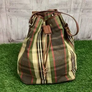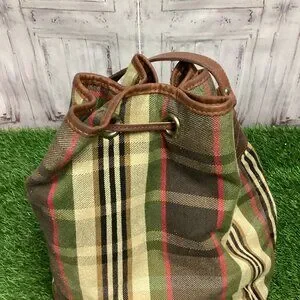 Plaid tan and brown bucket bag. Fux leather trim and strap, lined inside, drawstring pull on top. Nice bag for running around. The strap has a mark on it, please see photos. Otherwise good used condition, some wear.