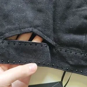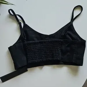 Discover comfort and style with this elegant black denim cropped top. Perfect for everyday wear. has smocking in the back and little black studs on the trim. size 6 would fit a small/medium