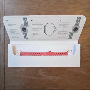 Brand new, opened yet never worn, unsealed box, Made with compression-molded perforations for breathability, the Nike Sport Band is durable and strong, yet surprisingly soft. It features colorful flakes that create a randomized pattern, making each band completely unique. The smooth, dense material drapes elegantly across your wrist and feels comfortable next to your skin. An aluminum pin-and-tuck closure gives the pin a fresh matte finish.