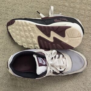 Nike Air Max sneakers featuring a stylish gray and maroon color scheme. Comfortable and trendy design. Good Condition. Size 8