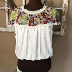 Free People Embroidered Floral Sheer Top Blouse Cotton Tee Bubble Hem