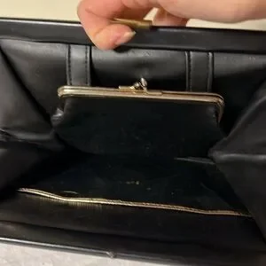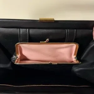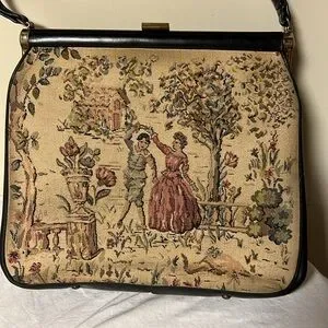 Vintage double sided tapestry purse featuring a man and woman dancing in a garden. Please see all pictures. Measurements are in the pictures. This has a clasp opening on the top, which reveals an inner pocket and also an interchange purse. This estate find is being sold as found and has not been cleaned or altered. Please see all pictures.
