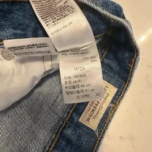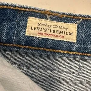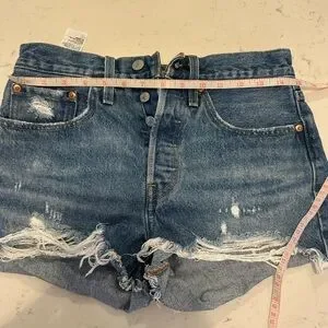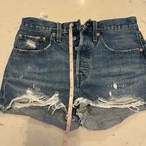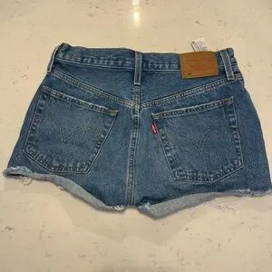 These Levi's jean shorts feature a classic blue hue with a stylish distressed look and a raw, cut-off hem for a casual vibe. The high-waisted design adds a touch of vintage flair, making them perfect for laid-back outings.