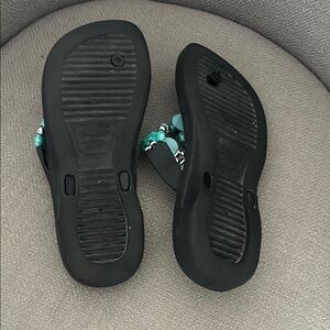 Stylish black sandals with turquoise bead accents. Perfect for casual wear.