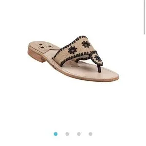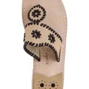 Experience timeless elegance with Jack Rogers sandals, featuring a tan leather base and striking black whipstitched detailing. These classic sandals boast a flat sole and a signature medallion design, perfect for adding a touch of sophistication to any warm-weather ensemble.