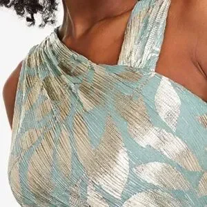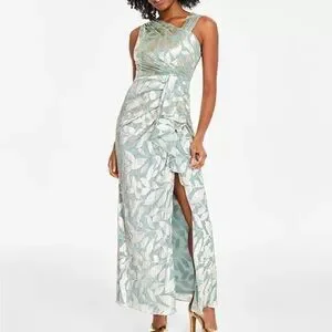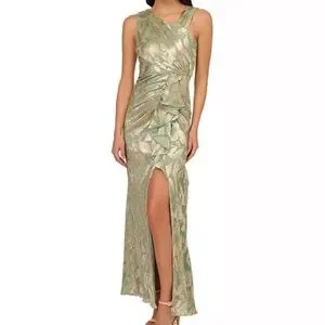 Elevate your evening look with this stunning green maxi dress by Adrianna Papell. Designed for cocktail and night out occasions, it features an elegant slip style with an asymmetrical silhouette, ruching details, and a dramatic side slit for added allure.