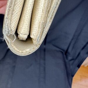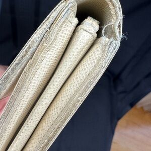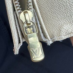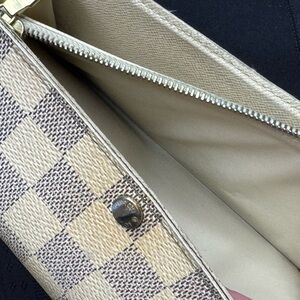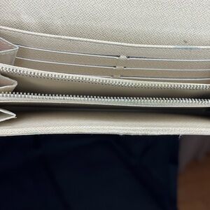 Elegant wallet with iconic checkered design. Features cream and gray tones. Perfect for everyday use.