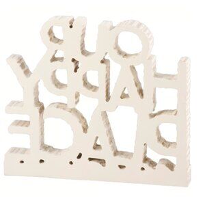 A wooden chunky sitter from our Beach Collection featuring a slatted and stacked "Our Happy Place" sentiment with wave designs. Our Happy Place sign complements well with coordinating design pieces.