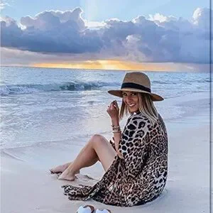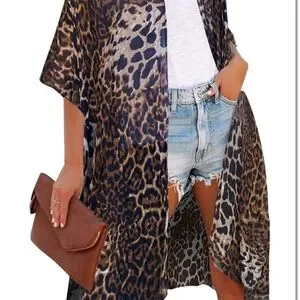 Stylish leopard print swim cover-up for a chic beach look. Perfect for adding flair to your swimwear ensemble.