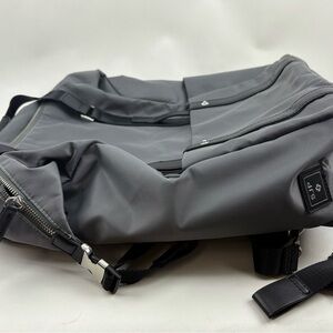 This SJP by Sarah Jessica Parker backpack features a sleek gray body contrasted by black straps and trim, offering a minimalist and modern aesthetic. Crafted from durable synthetic material, it boasts a structured shape and substantial capacity, making it ideal for daily use or travel. The reinforced top handles and clean lines enhance its stylish yet utilitarian appeal.