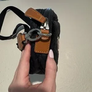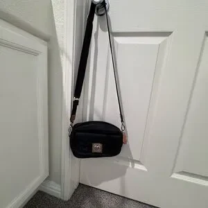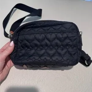 Stylish black quilted crossbody bag with heart details. Perfect for everyday use.