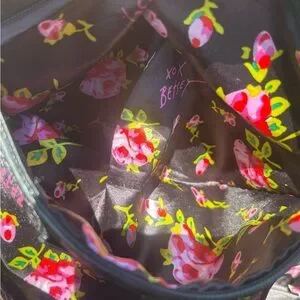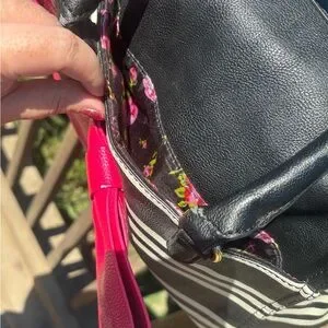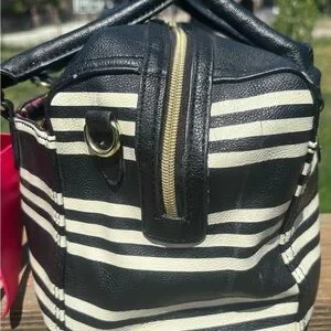 This Betsey Johnson satchel showcases a bold black and white striped pattern, complemented by a dramatic red bow for a playful yet sophisticated look. The structured double handles and medium-sized rectangular shape make it a versatile accessory for any occasion. Some signs of wear, no rips or tears in lining.