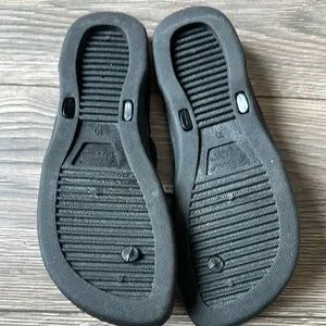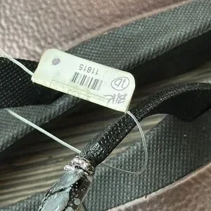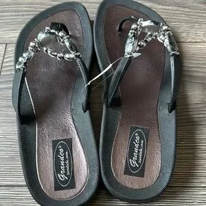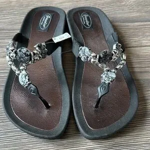 These stylish sandals boast a contoured footbed for comfort and a decorative thong strap adorned with silver-toned floral accents. The combination of black and brown colors adds versatility, making them ideal for both casual and dressy summer occasions.