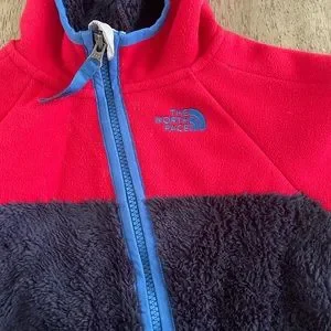 Cozy one piece with hood. Red sleeves and hood. Navy body with blue zipper. Perfect for warmth and comfort.