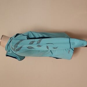 Used, very good condition The North Face Flight Series Vapor Wick Hoodie 1/2 Zip Shirt, size large. The right sleeve features a peacock feather print. The shirt features a left chest zippered pocket and a fold-over closure pocket on the lower back. The sleeves are extra long with a extra piece of fabric to cover hands when cold. Body: 88% polyester, 12% elastane; Panel: 100% polyester. Machine washable.
