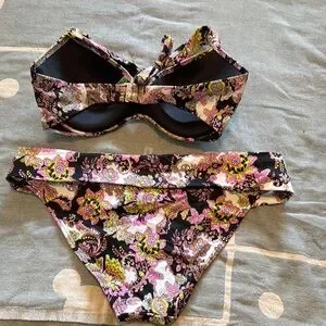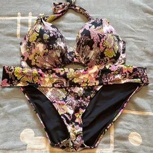 Chic floral bikini by Victoria's Secret. Features vibrant pink and green patterns on a black base. Stylish and comfortable.