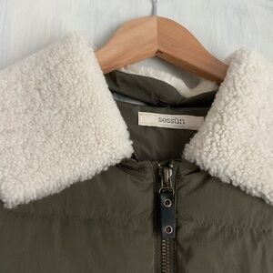 Beautiful warm garment. Detachable real fleece/suede collar. French brand Sessun. Size large.