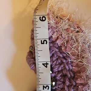 Hand-crocheted with three luxurious yarns—Premier Just Yarn Worsted in purple, Premier Just Chenille in light mauve, and Gala Yarns Fun Fur Eyelash in ivory—this piece offers soft texture and visual dimension. It’s built on a 3" pink elastic band for flexibility and comfort and embellished with 14 multicolored upcycled plastic beads that shine with a rainbow finish.