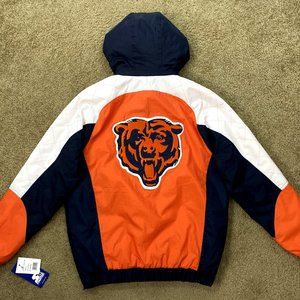New w Tags CHICAGO BEARS Starter Half Zip Jacket. High quality Pull Over Hooded Nylon Jacket . Hood is removable and zips off. The jacket has a Nylon outer shell and the inside lining is soft polyester. The "BEARS" Lettering BEARS Logo meticulously sewn on. New STARTER 2019. Color: BLUE with ORANGE Trim Satisfaction guaranteed or return. Measurements: S: 22, M: 23.5" L: 25" XL 26.5" 2X: 28" This is a Medium weight Winter Jacket that flows with your body. Jacket has 2 outer pockets & pouch.