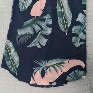 • Navy blue background with allover large tropical print (pink flowers and green palm leaves)