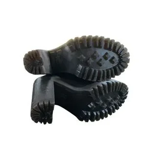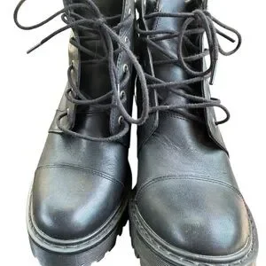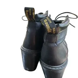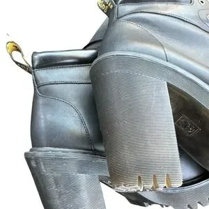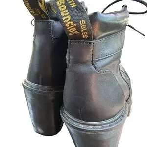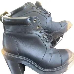 Experience the perfect blend of style and durability with these Dr. Martens black heeled boots. Featuring a chunky high heel and rugged combat-style design, these boots are crafted from sturdy black leather with a cap toe and metal eyelets for lacing. The substantial rubber sole ensures long-lasting wear and comfort.