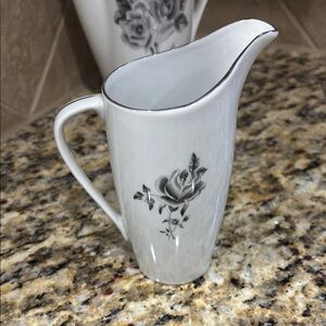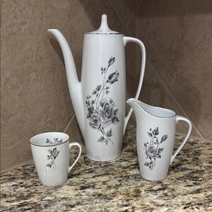 This elegant coffee set adds a touch of sophistication to your kitchen with its white and gray floral design. The set includes a mid-century modern style coffee pot and matching cups, perfect for both daily use and special gatherings. Crafted from high-quality porcelain, it seamlessly blends style and functionality.