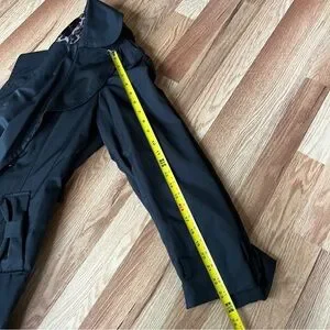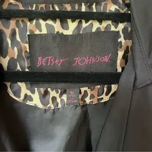 This Betsey Johnson trench coat in classic black features a feminine silhouette with a ruffled hem and a fitted waist that flares slightly. Its smooth, structured material offers a chic and versatile look, perfect for any occasion.