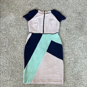 This Maeve dress showcases an asymmetrical design in striking blue and green hues, perfect for both work and cocktail occasions. The short raglan sleeves and crew neck add a modern touch to the sheath silhouette, making it a versatile addition to any wardrobe.
