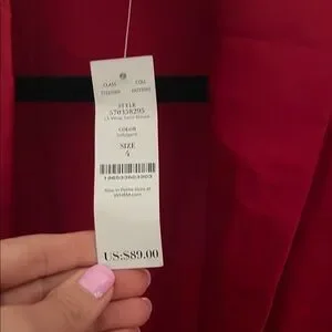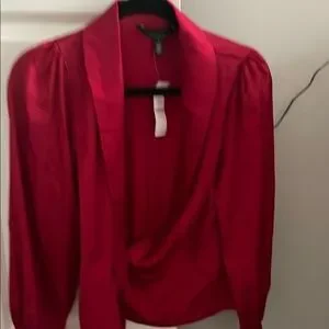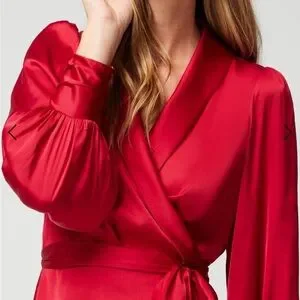 Elegant red wrap blouse. Long sleeves with a tie waist. Perfect for a chic look.