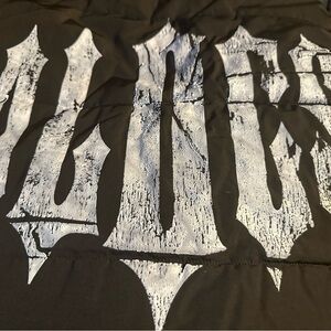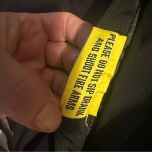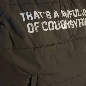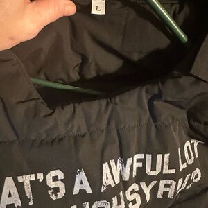 Stylish black jacket with bold white graphic text. Perfect for casual wear.
