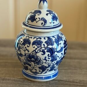 Elegant blue and white ceramic ginger jar with intricate patterns. Perfect for adding a touch of classic style to your home decor.