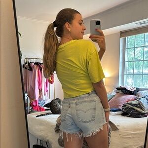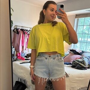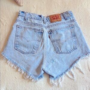 These are the perfect pair of vintage jean shorts! The color, the distressing and the fit are perfect. See photos for spots that are believed to be hand distressed. Small separation between pocket & short (as seen in photo) but fits in with overall distress look and isn’t noticeable when wearing.