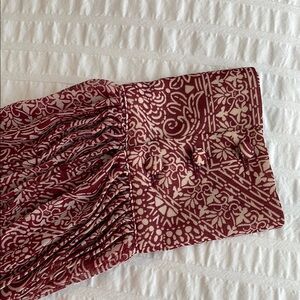 This Sezane dress is a perfect blend of elegance and versatility, featuring a pleated design with a tie back detail. Smocking at waist. Fully lined. The long bishop sleeves and crew neck add a touch of sophistication, making it ideal for wedding guest appearances or casual outings. Color is burgundy and cream. This dresseffortlessly combines style and comfort.
