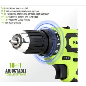 The cordless drill driver is powered by a max powerful 20-Volt, 1.5AH Lithium-ion battery for enough power for a full range of applications .It features a 3/8 in. keyless chuck with a 19-position clutch adjusts torque output to control the depth of the screw or fastener. The drill is designed with variable 2-speed settings (0-400 rpm and 0-1500 rpm) for multiple purposes.