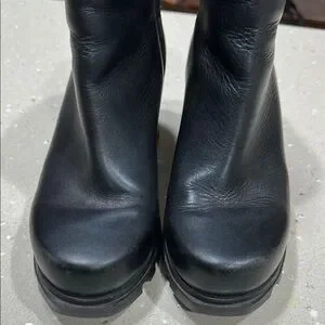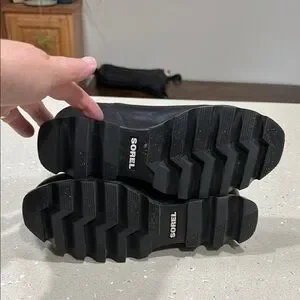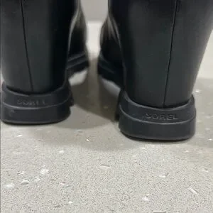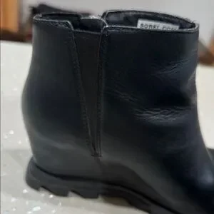 Step into style with Sorel's sleek black ankle booties, featuring a contemporary wedge heel and durable rubber sole for superior traction. The minimalist design is enhanced by practical side zippers, ensuring easy wear and a chic look for any occasion.