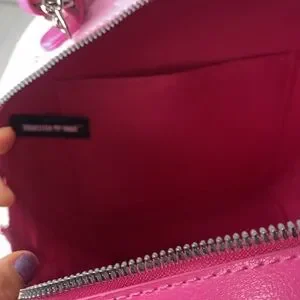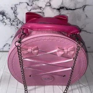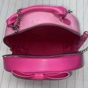 Chic and stylish pink round crossbody bag featuring a chain strap and bow accents. Perfect for adding a playful touch to any outfit.