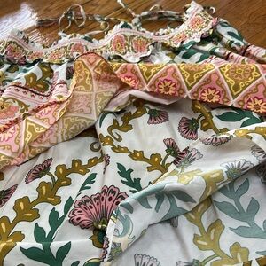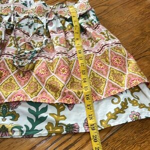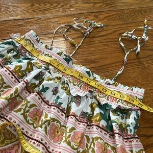 Anthropologie x Sarah Hann tiered floral babydoll top. Elastic bodice, ties at shoulders. Tiered ruffle design. Fabric is 100% cotton in mustard. Pinks and green floral print. New with Tags. Size Large.