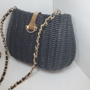 Vintage Black Coated Wicker Shoulder Clutch Purse Crossbody Gold Clasp