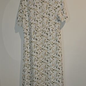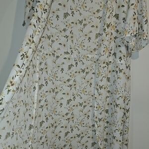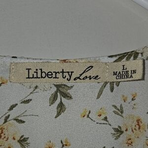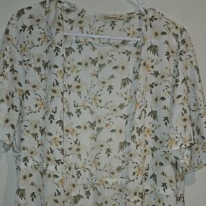 This Liberty Love duster showcases a graceful, flowing design with a charming floral pattern in white and green. The short sleeves and lightweight fabric ensure a comfortable and breezy fit, ideal for a relaxed day out.