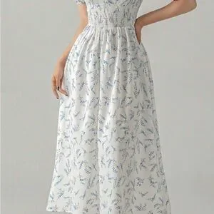 Step out in style with this elegant off-shoulder floral dress. Featuring a delicate blue floral pattern on a white background, this dress is perfect for any occasion. Enjoy the comfort and chic design that makes it a must-have in your wardrobe.