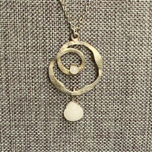 This necklace is like a modern art exhibit for your neck. The swirled pendant with faux pearl accent and organic shaped dangle scream chic sophistication, but not too loudly.